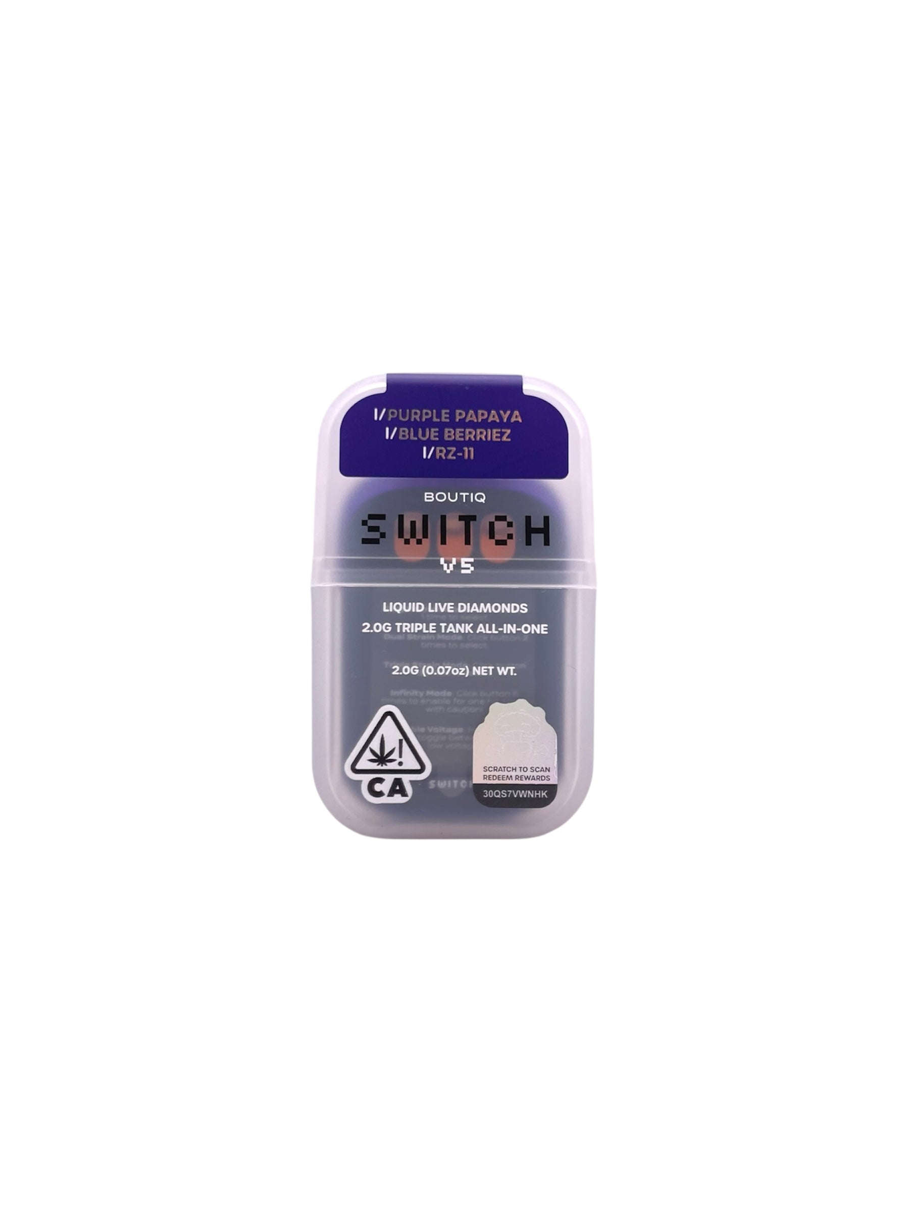 Boutiq Switch Liquid Live Diamond 2g Disposables. Three flavors in one device (3 Tanks) you can switch with the click of a button or use all three flavors at once! Purple Papaya (I) + Crunch Berriez (I) + RZ-11 (I).